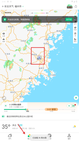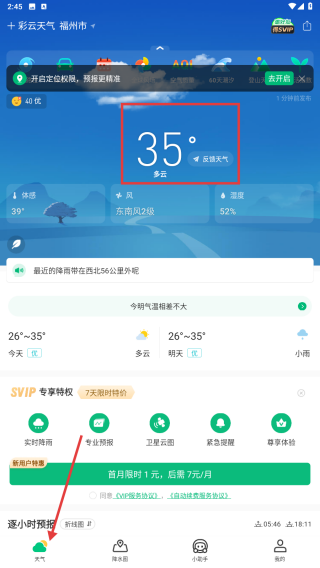 1、打開彩云天氣APP,進(jìn)入天氣頁面,查看福州市的實(shí)時(shí)天氣,溫度35°,天氣多云,還有體感溫度、風(fēng)力、濕度等信息,以及今日氣溫范圍和天氣趨勢(shì)。