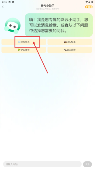 3、切換到天氣小助手頁面,可發(fā)送消息咨詢,也能從降水信息、出行指南等選項(xiàng)中選擇問題進(jìn)行詢問。