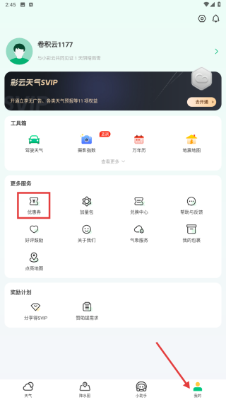 4、點(diǎn)擊底部我的選項(xiàng),進(jìn)入個(gè)人頁面,可查看彩云天氣SVIP相關(guān)權(quán)益,使用工具箱里的各項(xiàng)功能,還能在更多服務(wù)中找到優(yōu)惠券等選項(xiàng)。
