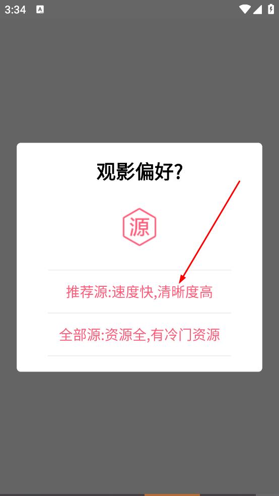 4、在觀影偏好選擇頁(yè)面,可選擇推薦源:速度快,清晰度高或全部源:資源全,有冷門(mén)資源。