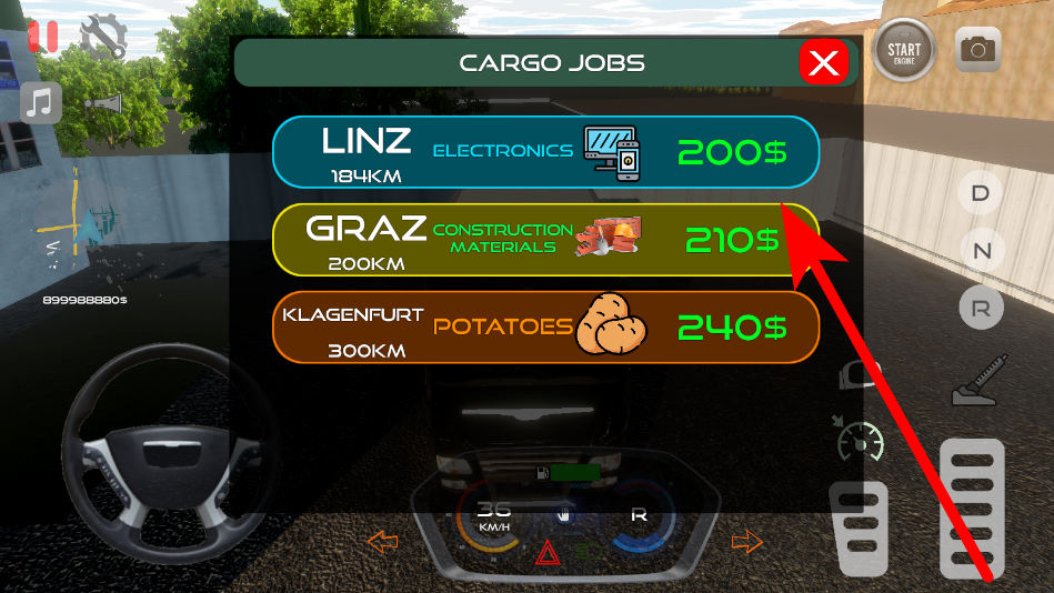 4、選擇運(yùn)輸任務(wù),運(yùn)輸任務(wù)選擇界面,有不同的運(yùn)輸任務(wù)可供挑選,選定后,便要駕駛卡車將貨物運(yùn)往指定地點(diǎn),完成運(yùn)輸任務(wù)。
