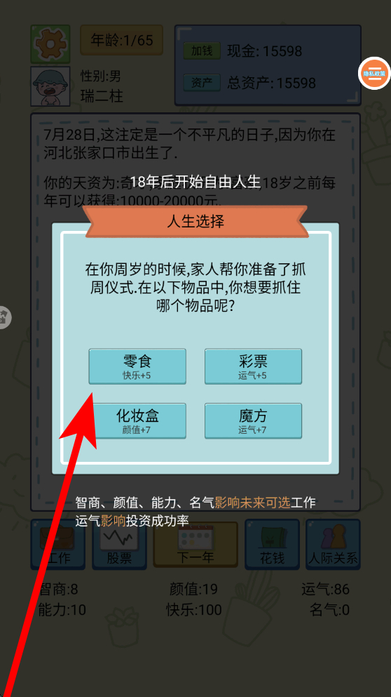 2、在人生的不同階段,會出現(xiàn)諸如抓周等選擇場景,不同選擇會帶來不同屬性加成,比如選擇零食能增加快樂,需根據(jù)自己的規(guī)劃做出選擇。