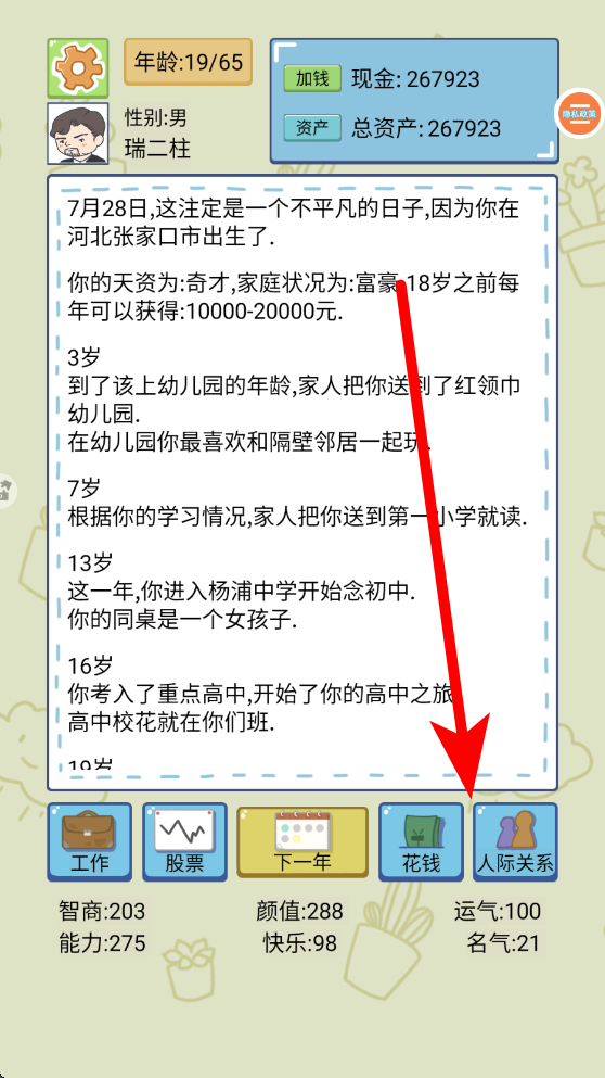 4、經(jīng)營人際關(guān)系,界面有人際關(guān)系相關(guān)功能,可與他人進行互動,維護和拓展人際關(guān)系,良好的人際關(guān)系也會為人生帶來諸多助力。