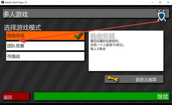 2、若選擇多人游戲,進(jìn)入模式選擇界面,如自由交戰(zhàn)模式,了解規(guī)則為最后存活玩家勝利,擊殺一人得100分,每人10條命。