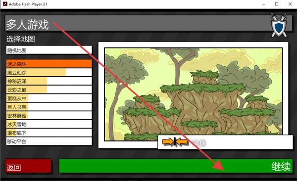 3、選定模式后點擊繼續(xù),進(jìn)入地圖選擇界面,挑選喜歡的地圖,像迷之森林,確認(rèn)后再次點擊繼續(xù)。