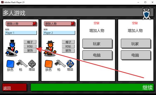4、進(jìn)入角色設(shè)置界面,可對已有角色的帽子、襯衫、裝飾、膚色、槍及增益效果進(jìn)行調(diào)整,也能點擊增加人物添加新角色,準(zhǔn)備好后點擊繼續(xù)開啟游戲。