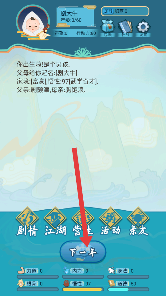 1、查看參與者出生后,點(diǎn)擊下一年的按鈕,推進(jìn)基本的時(shí)間,繼續(xù)開啟了后續(xù)的成長與游戲的進(jìn)程。