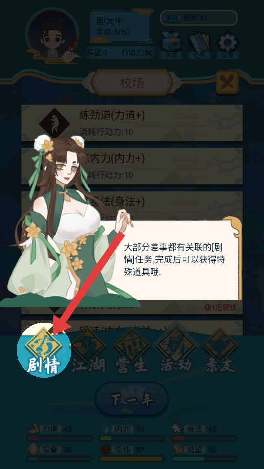 1、年度行動(dòng)自由規(guī)劃:從出生開始,每年都能自由選擇要開展的行動(dòng),既可以選擇闖蕩江湖增長閱歷,也能拜師學(xué)習(xí)各類武功技能,規(guī)劃專屬的成長的路徑。