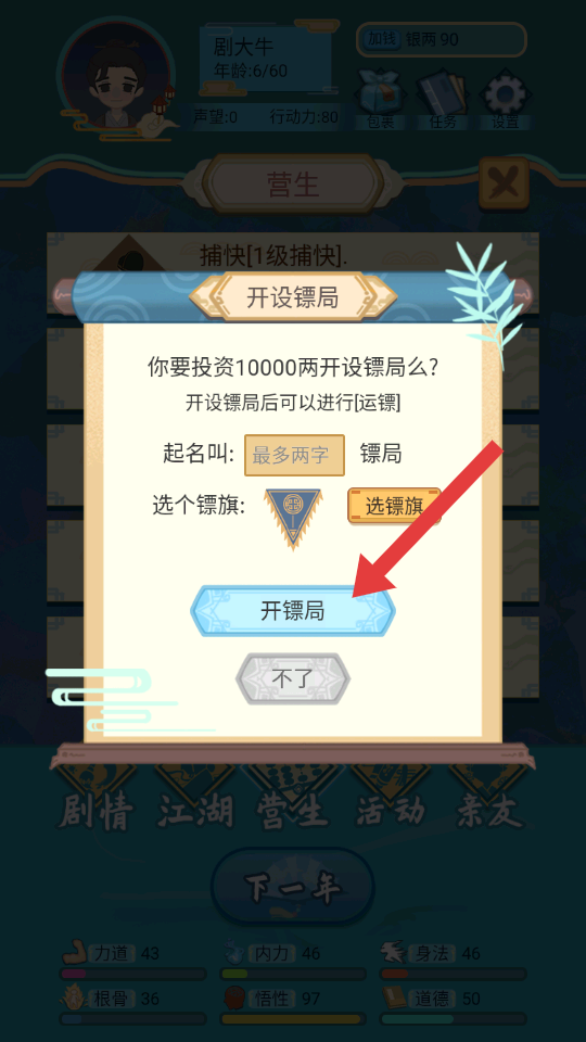 3、若有足夠資金,點(diǎn)擊開鏢局的相關(guān)的按鈕,可以允許開設(shè)鏢局,可開展運(yùn)鏢等營生活動(dòng),獲取收益。