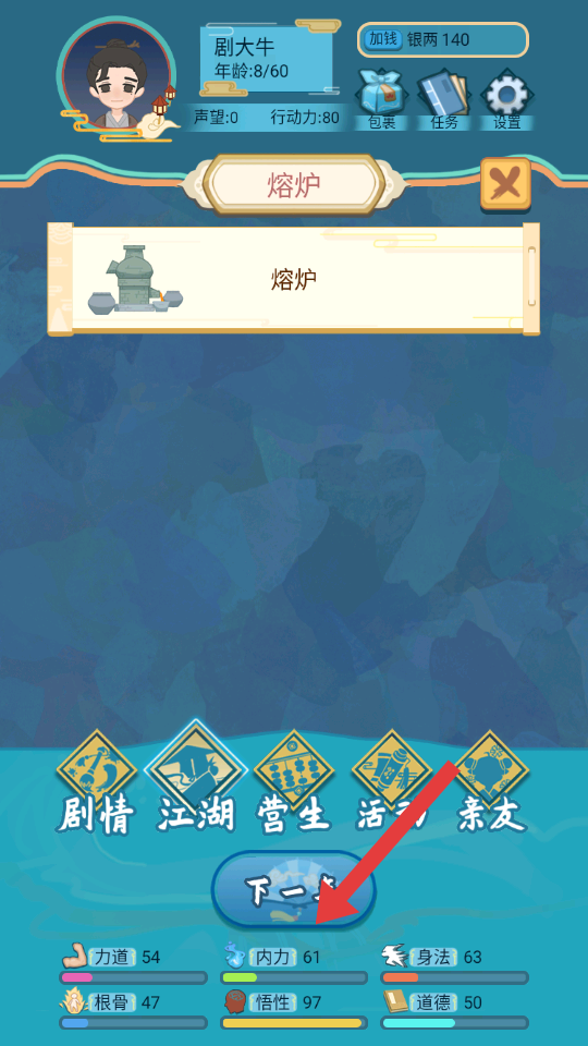 4、關(guān)注角色的內(nèi)力屬性條,通過相關(guān)修煉或活動(dòng),提升了內(nèi)力值,最好的增強(qiáng)角色的武學(xué)的能力。