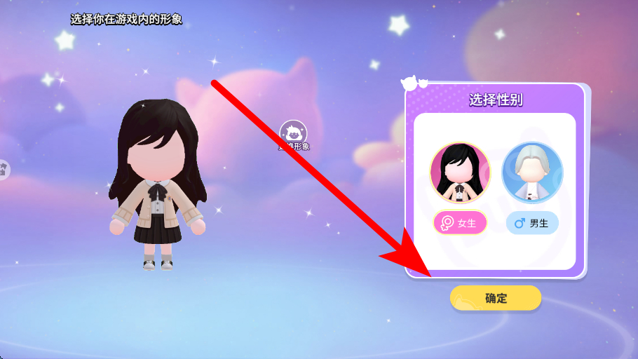 1、創(chuàng)建形象時,在選擇界面挑選游戲內(nèi)的形象性別,確定后點(diǎn)擊確定,完成形象的創(chuàng)建,開啟在休閑社交類作品中的游玩之旅。
