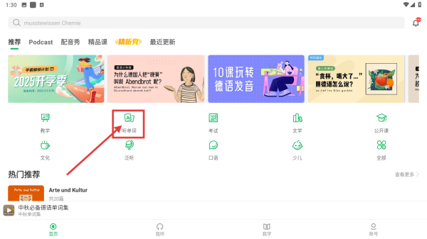 1、打開(kāi)德語(yǔ)學(xué)習(xí)類應(yīng)用,點(diǎn)擊聽(tīng)單學(xué)詞選項(xiàng),進(jìn)入相關(guān)學(xué)習(xí)頁(yè)面。