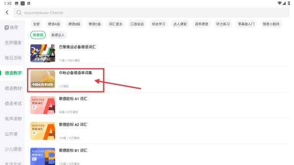 2、在學(xué)習(xí)頁(yè)面,找到中秋必備德語(yǔ)單詞集,點(diǎn)擊進(jìn)入該單詞集詳情頁(yè)。