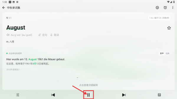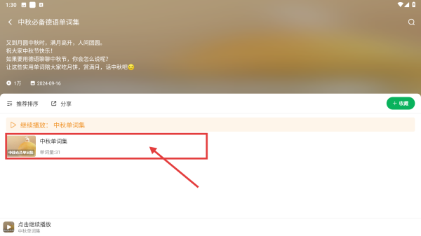 3、在單詞集詳情頁(yè),點(diǎn)擊中秋單詞集,開(kāi)始學(xué)習(xí)中秋相關(guān)德語(yǔ)單詞。