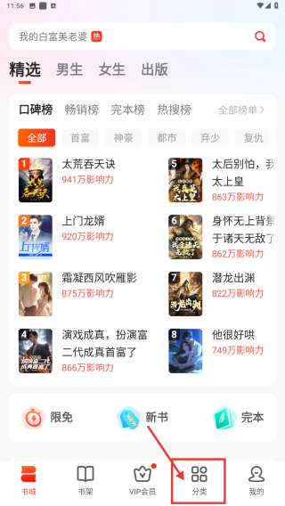 1、打開(kāi)小說(shuō)閱讀類(lèi)應(yīng)用,點(diǎn)擊底部分類(lèi)選項(xiàng),進(jìn)入分類(lèi)頁(yè)面。