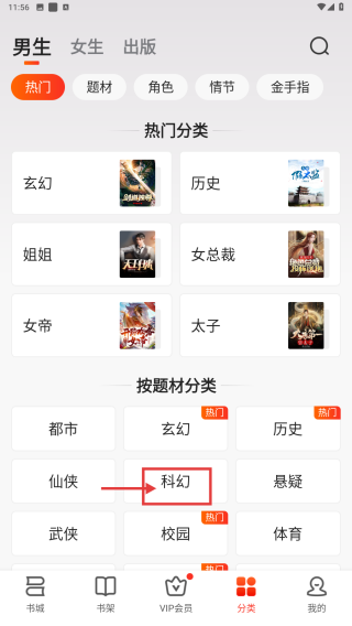 2、在分類(lèi)頁(yè)面,點(diǎn)擊科幻題材標(biāo)簽,進(jìn)入科幻類(lèi)小說(shuō)列表頁(yè)。