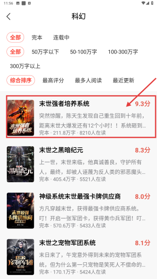 3、在科幻類(lèi)小說(shuō)列表里,選擇末世強(qiáng)者培養(yǎng)系統(tǒng)評(píng)分為9.3分,點(diǎn)擊進(jìn)入小說(shuō)詳情頁(yè)。