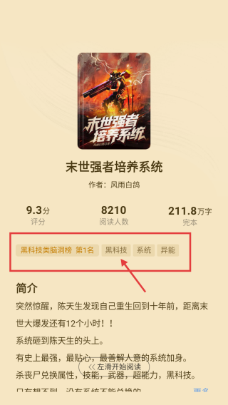 4、在小說(shuō)詳情頁(yè),可查看該書(shū)是黑科技類(lèi)腦洞榜 第1名等標(biāo)簽,以及小說(shuō)簡(jiǎn)介等內(nèi)容。