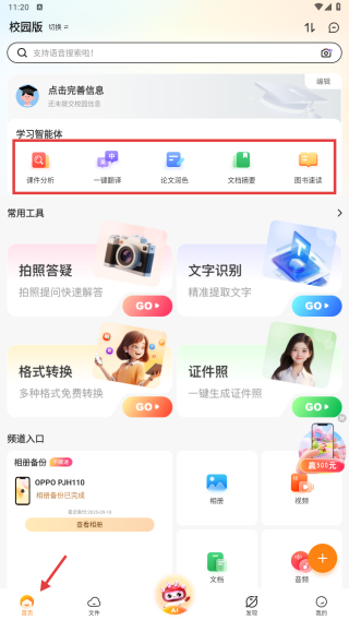 1、進入APP首頁,可使用學習智能體板塊的課作分析一鍵翻譯等功能,也能通過常用工具里的拍照答疑文字識別等工具解決需求。