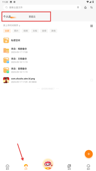 2、點擊底部文件選項,進入文件頁面,可查看個人云家庭云中的各類存儲文件,如照片、視頻、文檔等。