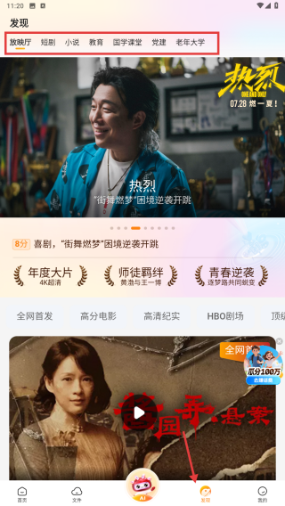 3、切換到發(fā)現頁面,能瀏覽院線短劇小說等不同分類的視頻內容,選擇感興趣的進行觀看。