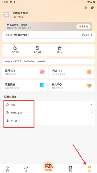 4、點擊底部我的選項,進入個人中心,可進行設置幫助與反饋關于我們等相關操作,還能查看流量權益、會員中心等信息。