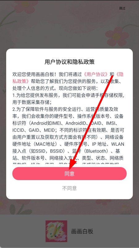 1、打開畫畫白板APP,在彈窗中點(diǎn)擊同意,進(jìn)入首頁。