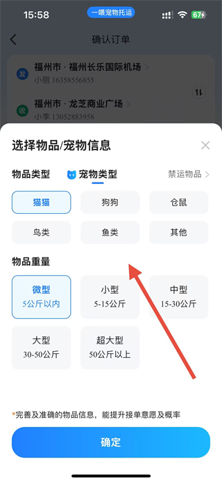 3、彈出選擇寵物類型和物品重量等信息,選擇后點(diǎn)擊確定。