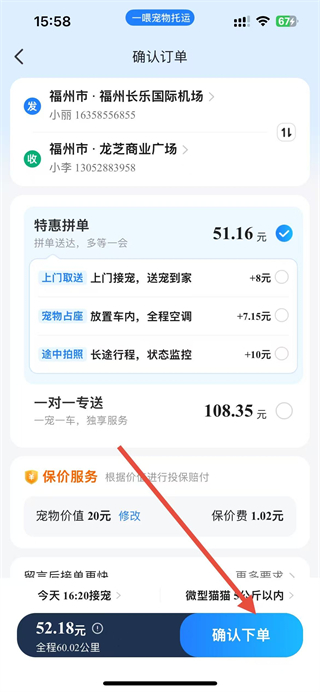 4、可以選擇保價(jià)服務(wù),根據(jù)填寫的寵物價(jià)值收取保價(jià)費(fèi),也可添加感謝費(fèi),點(diǎn)擊確認(rèn)下單,即可看到最終的收費(fèi)金額。