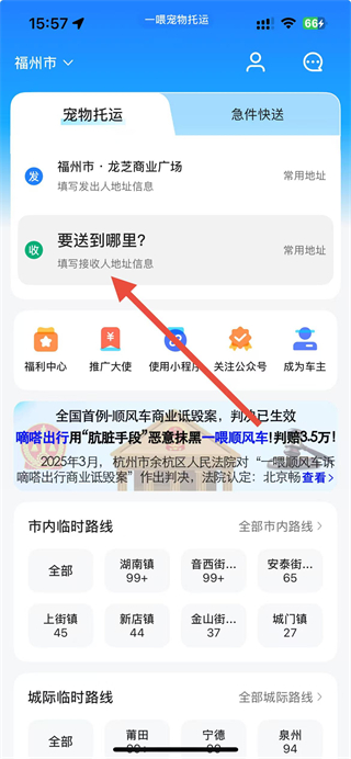 1、打開(kāi)一喂寵物托運(yùn)應(yīng)用,在首頁(yè)發(fā)欄填寫出發(fā)地址,在收欄填寫接收地址。