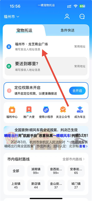 1、打開(kāi)一喂寵物托運(yùn)APP,在寵物托運(yùn)頁(yè)面填寫發(fā)出人地址信息。