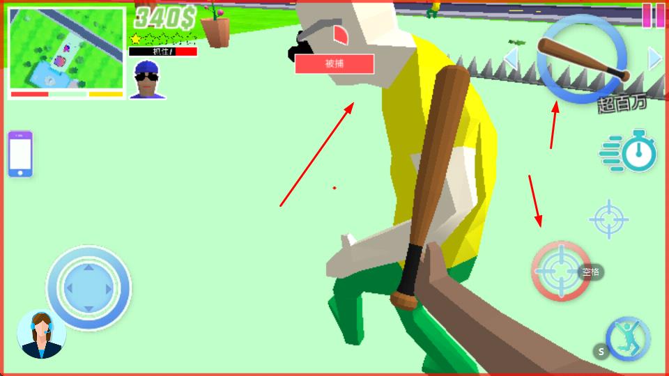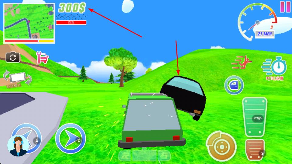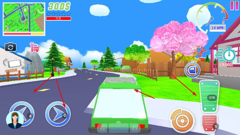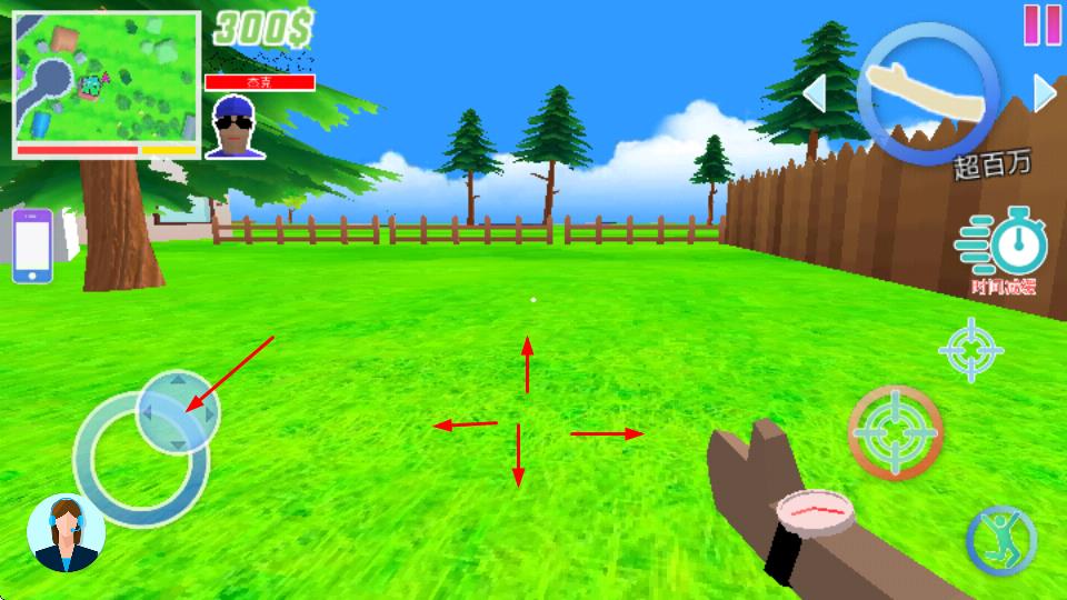 1、操控角色在草地、街道等場景移動,利用左側虛擬搖桿調整方向,探索地圖,初始可獲取300美元等資源。
