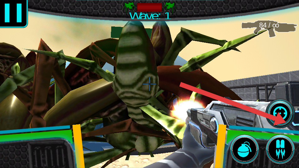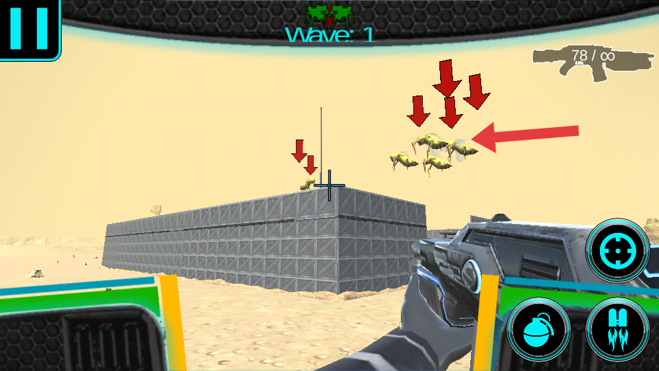 4、面對(duì)空中來(lái)襲的外星生物,調(diào)整射擊角度,集中火力攻擊,阻止它們突破防御,保障核心區(qū)域的安全,通過(guò)進(jìn)攻。