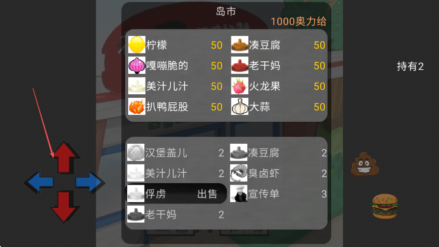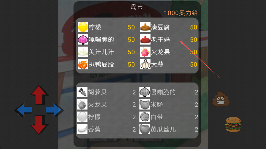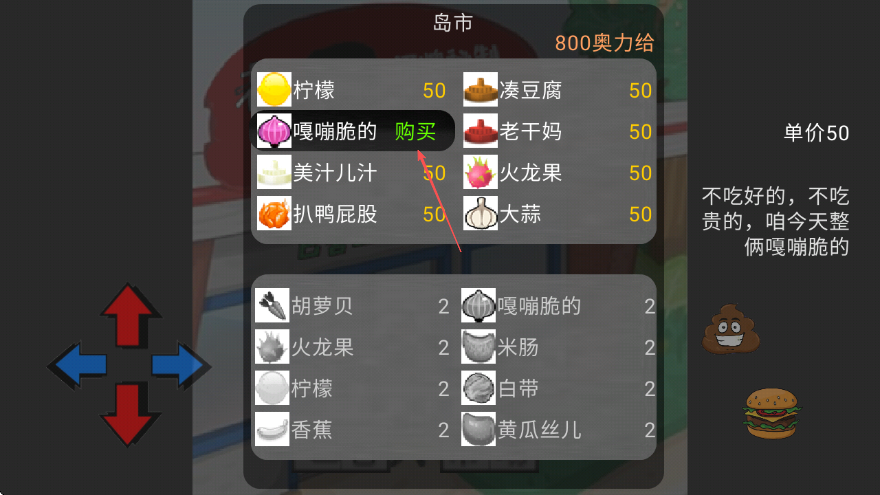 1、進(jìn)入游戲,通過屏幕左側(cè)方向鍵切換查看不同食材及其價格,如老干媽50奧力給。