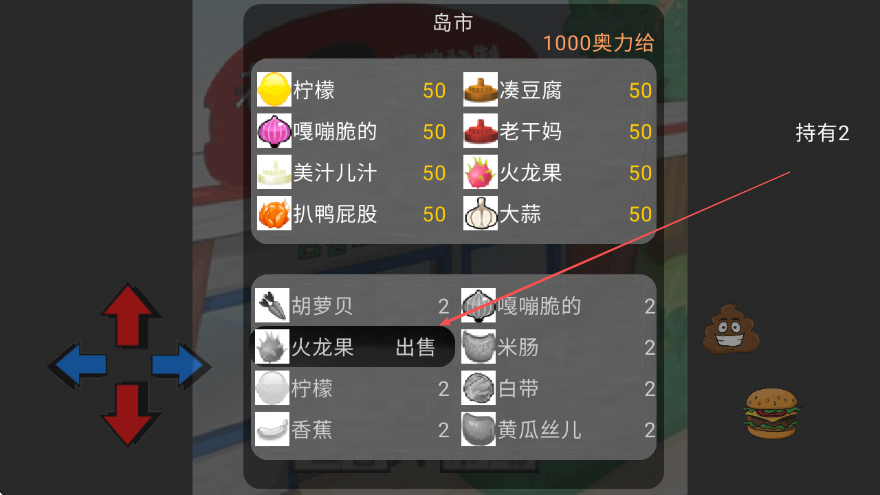 2、找到想要出售的食材,比如火龍果,點擊進(jìn)行出售操作獲取奧力給貨幣。