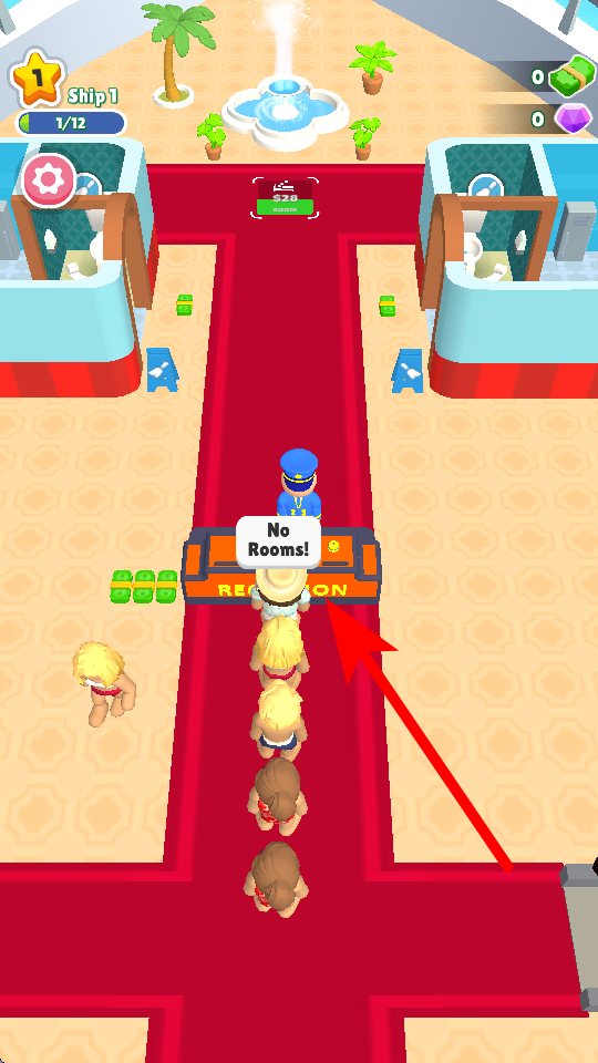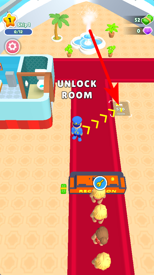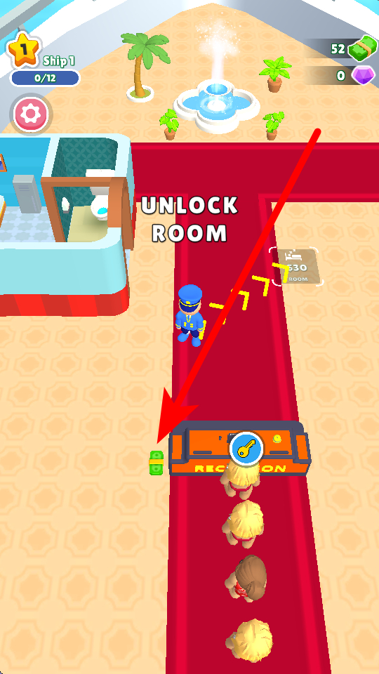 2、解鎖新房間需要前往前臺區(qū)域,花費相應的貨幣,就能開啟新的客房,增加可接待客人的數量,提升游輪的運營規(guī)模。