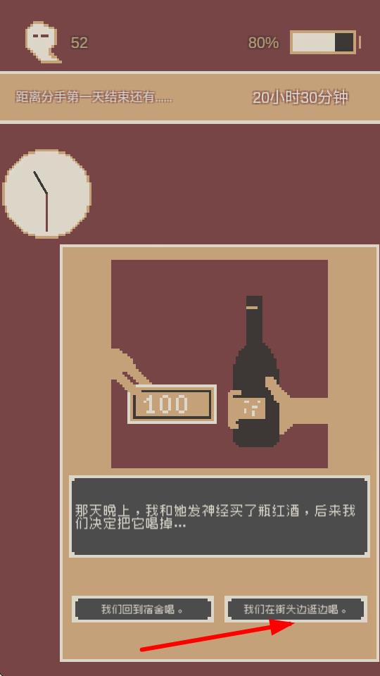 4、面對(duì)喝紅酒的場(chǎng)景選擇我們?cè)诮诸^邊逛邊喝,這種選擇展現(xiàn)了角色在分手后的行為狀態(tài),推動(dòng)劇情發(fā)展。