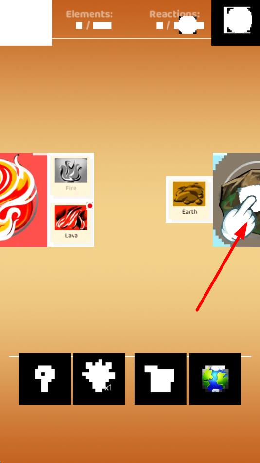 2、選擇Earth土元素,與火元素進(jìn)行合成,元素合成是游戲的核心玩法,不同元素組合生成新的物質(zhì)如熔巖,豐富內(nèi)容。