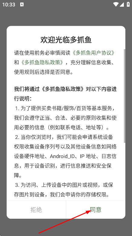1、在用戶協(xié)議彈窗中,點擊同意,進(jìn)入多抓魚主界面。