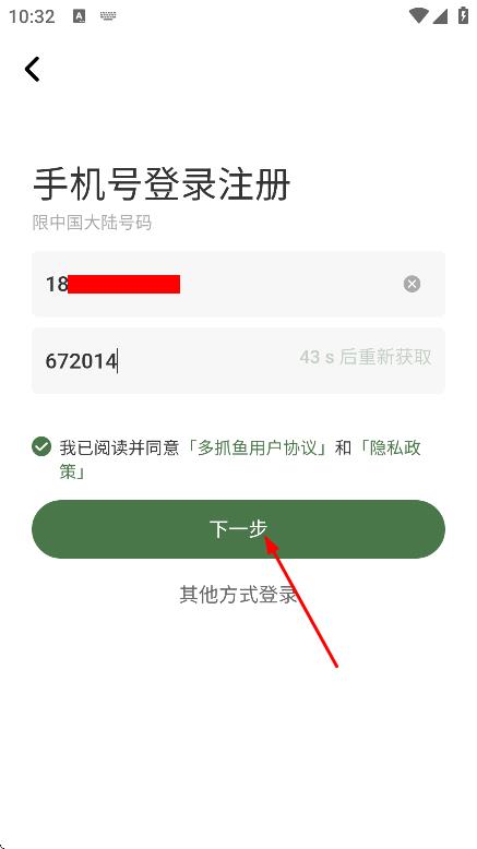 4、填寫手機號、驗證碼,點擊下一步,繼續(xù)登錄注冊流程。