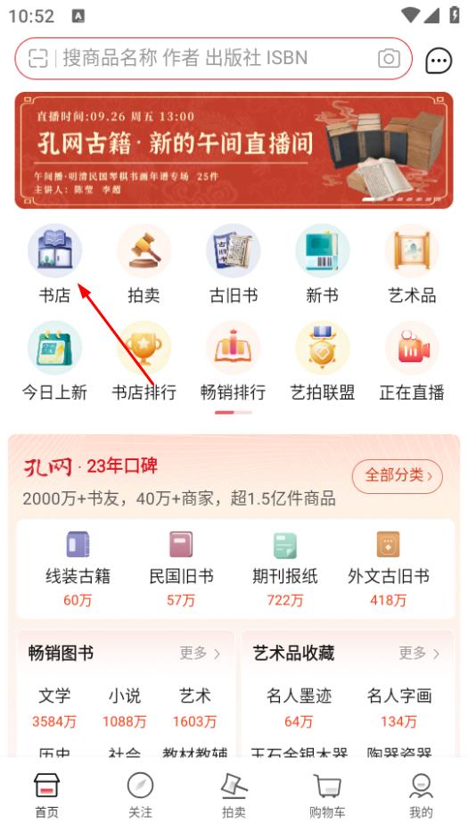 1、打開孔夫子舊書網(wǎng),點擊書店,進入孔網(wǎng)書店頁面。