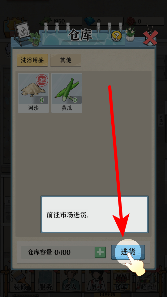 1、當(dāng)客人有沙浴需求且缺少河沙時(shí),要前往市場(chǎng)進(jìn)貨,進(jìn)入倉(cāng)庫(kù)界面,能看到洗浴用品等分類,點(diǎn)擊進(jìn)貨按鈕,就能補(bǔ)充河沙等物品,滿足客人沙浴需求。