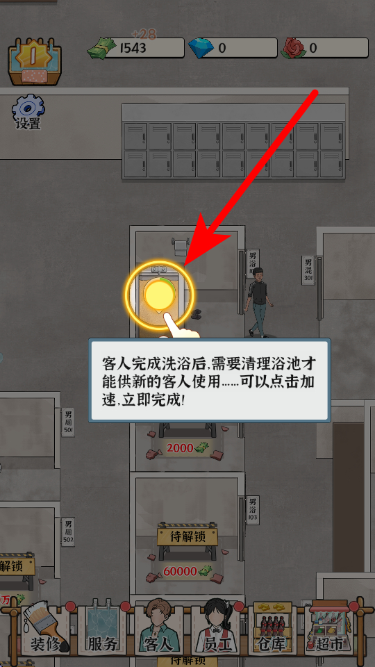 4、客人完成洗浴后,浴池需要清理才能供新客人使用,此時(shí)點(diǎn)擊加速按鈕,就能立即完成清理,讓浴場(chǎng)更快迎接下一位客人,保障浴場(chǎng)的運(yùn)轉(zhuǎn)效率。