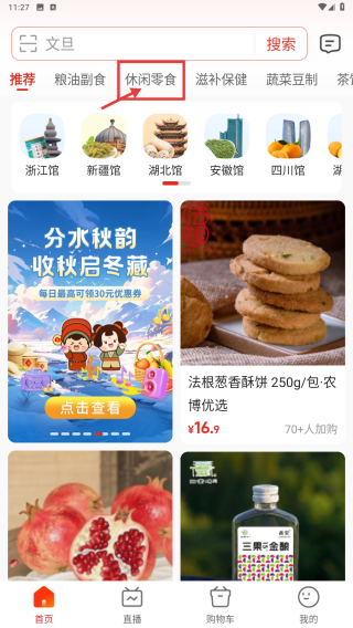 1、打開電商APP,點(diǎn)擊頂部休閑零食分類,進(jìn)入零食商品頁面。