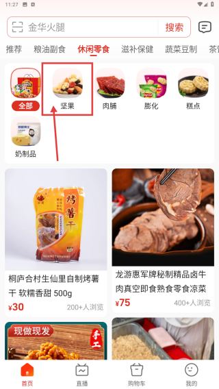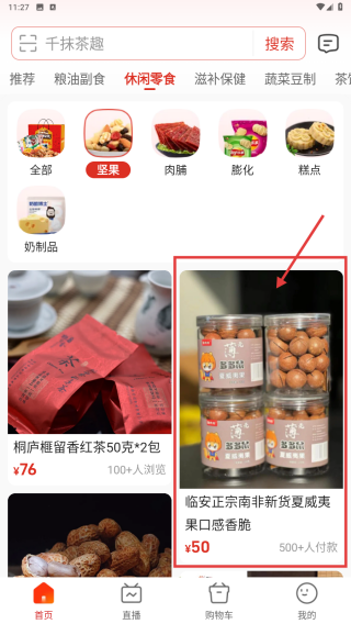 2、在零食分類中,點(diǎn)擊堅(jiān)果子分類,查看堅(jiān)果類商品。