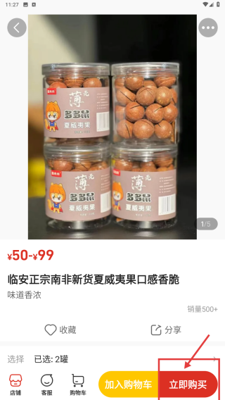 3、在堅(jiān)果商品列表里,點(diǎn)擊臨安正宗南非新貨夏威夷果條目,進(jìn)入商品詳情頁。