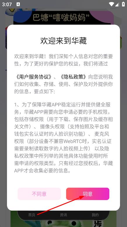 1、在歡迎來(lái)到華藏的彈窗中,點(diǎn)擊同意,進(jìn)入界面。