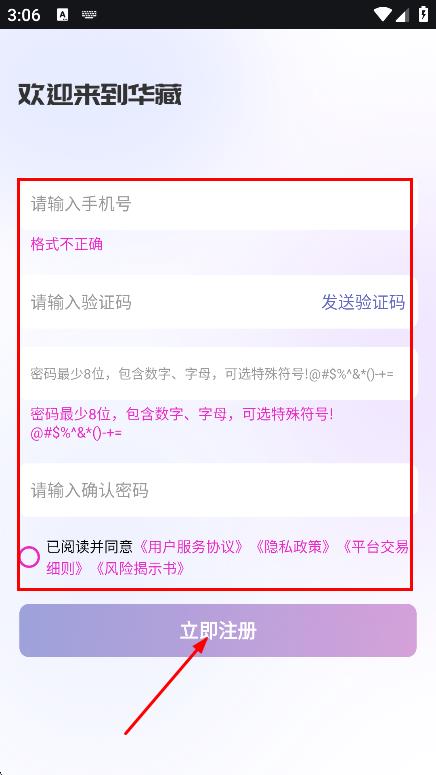 4、填寫手機(jī)號(hào)、驗(yàn)證碼、密碼等信息,點(diǎn)擊立即注冊(cè),完成注冊(cè)。