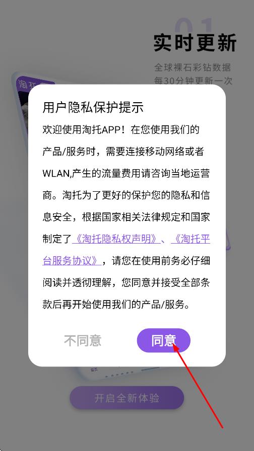 1、在用戶隱私保護提示彈窗中,點擊同意,進入登錄淘托頁面。