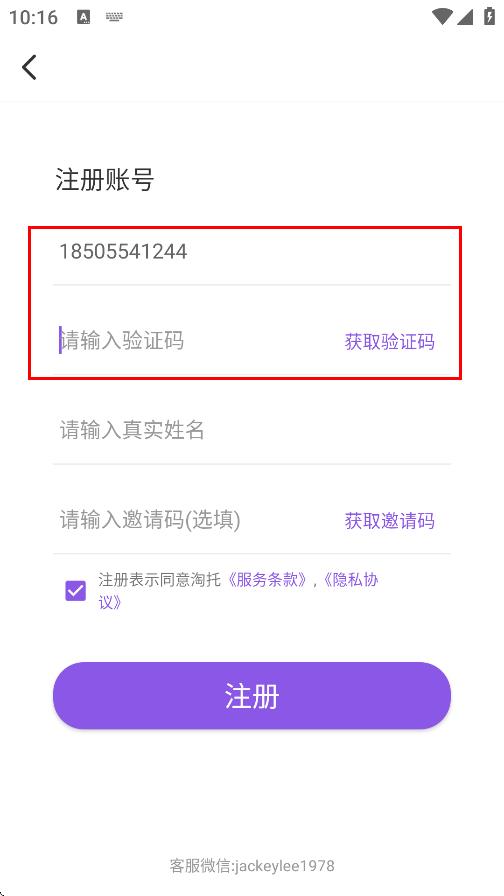 3、在注冊賬號頁面,輸入手機號碼,獲取并輸入驗證碼。